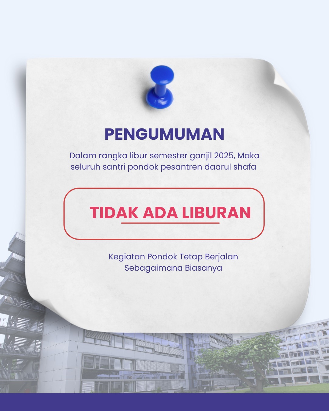 <p><span style="color:hsl(0, 0%, 100%);">Assalamu'alaikum wr. wb. </span><br><span style="color:hsl(0, 0%, 100%);">Kpda: Bpk/ibu Wali Santri Pondok Pesantren Daarul Shafa</span><br><span style="color:hsl(0, 0%, 100%);">Mohon maaf dan kerjasama bahwa selama selesai semester Santri putra /santri putri Tidak ada ( LlBURAN ) kegiatan belajar dipodok seperti bisa. </span><br><span style="color:hsl(0, 0%, 100%);"> Dimohon kerjasama kepala wali santri agar santri putra/putri belajr dengan istiqomah. </span><br><span style="color:hsl(0, 0%, 100%);"> Wassalamualaikum wr. wb</span></p>